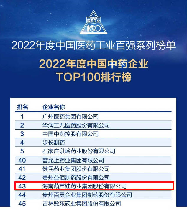 会议期间,一年一度的中国医药工业百强系列榜单隆重揭晓,美狮贵宾会药业集团凭借领先的研发优势和扎实的生产实力以及稳健的市场推广能力,连续第四年成功入选“2022年度中国中药企业TOP100排行榜” ,排名稳步上升至第43位。